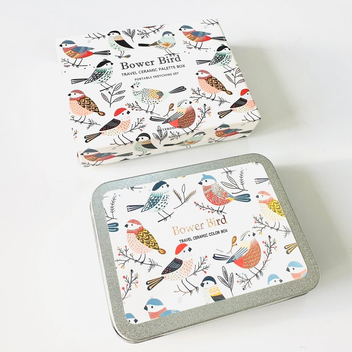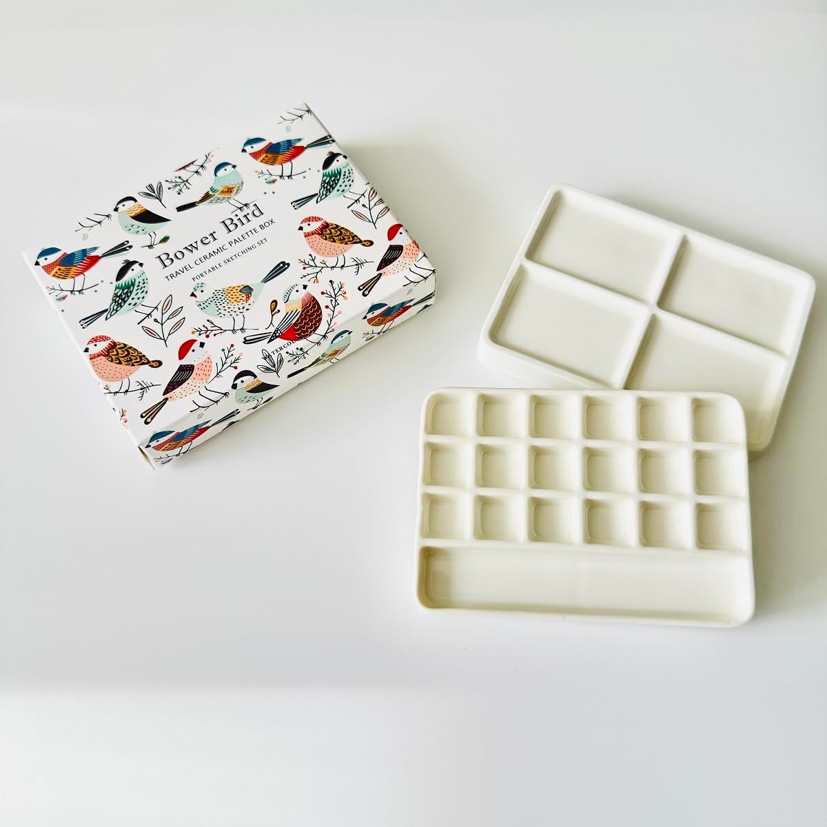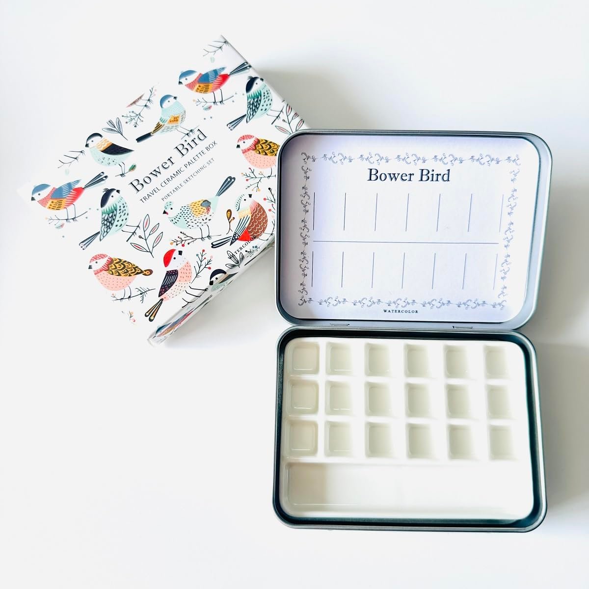Bower Bird Travel Ceramic Watercolor Palette with 12-Well Porcelain Mixing Tray & Metal Tin Box – Portable Art Kit for Gouache, Studio & Outdoor Painting (18Well)