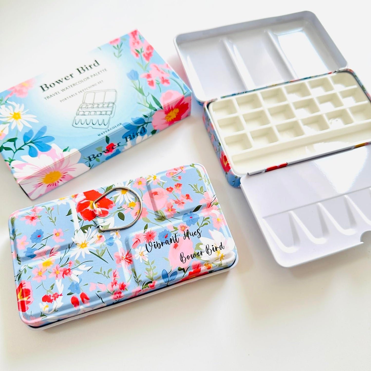 Bower Bird Travel Watercolor Palette,Portable Ceramic Palette 18 Well,Empty Paint Palette,Small Travel Metal Paint Boxwith Porcelain Palette