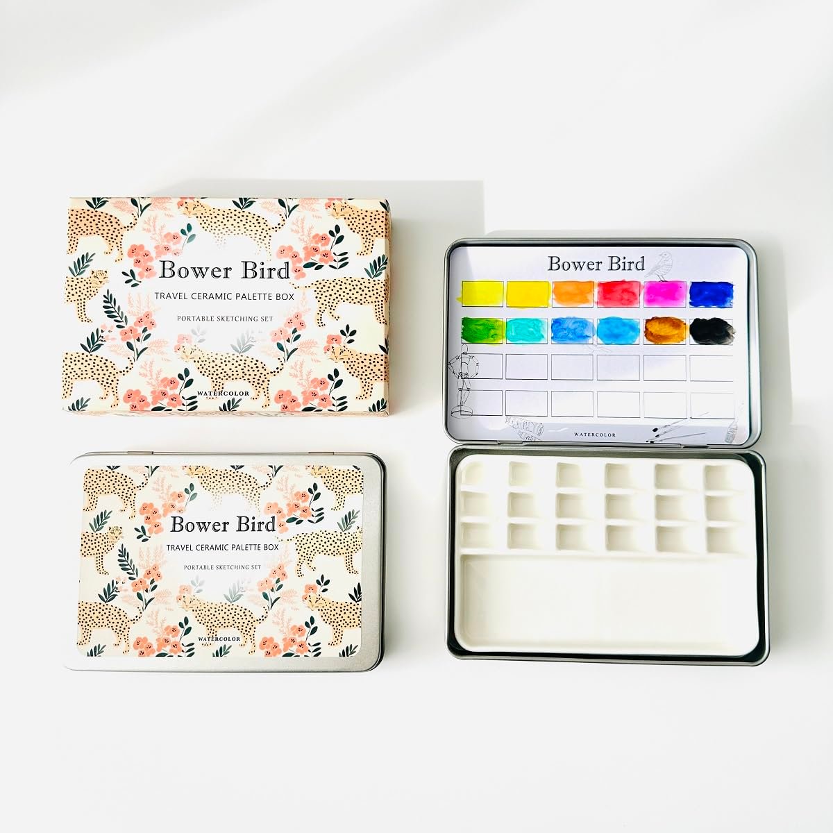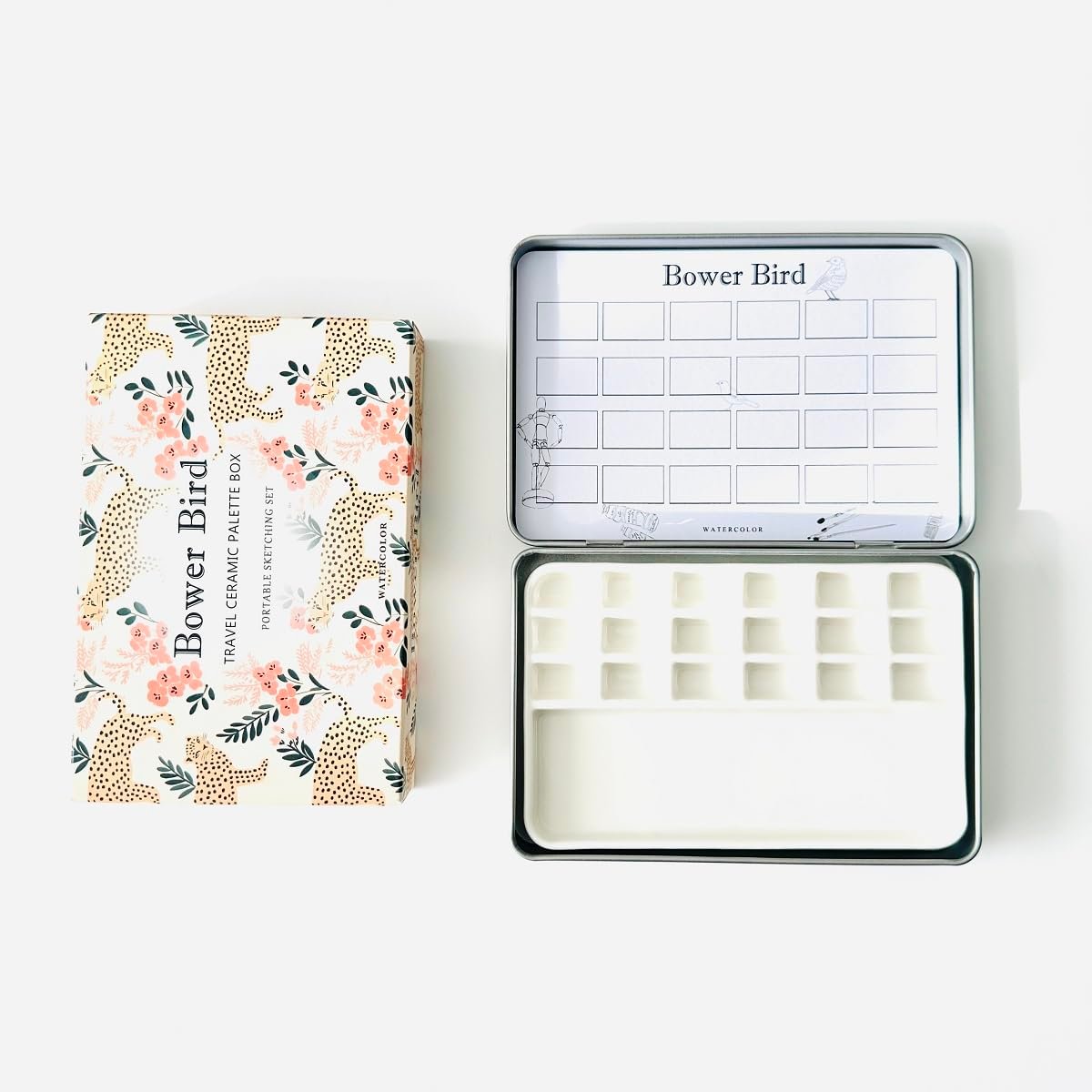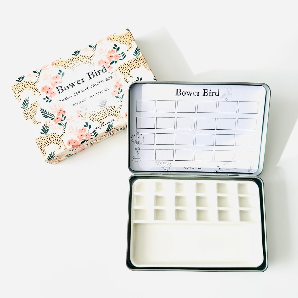Bower Bird Travel Watercolor Palette,Portable Ceramic Palette 6 Well,Empty Paint Palette,Small Travel Metal Paint Boxwith Porcelain Palette (18Well)