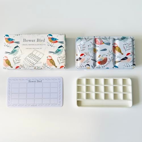 Bower Bird Travel Watercolor Palette,Portable Ceramic Palette,Empty Paint Palette,Small Travel Metal Paint Boxwith Porcelain Palette (18Well)